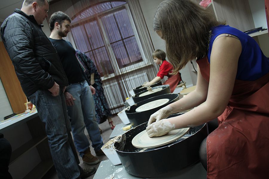 Гончарные круги не остались без внимания. Участники интересовались характеристиками и разработками, и конечно же все хотели попробовать себя в роли искусного мастера-гончара и слепить пару, тройку кувшинов и тарелок из глины которые они могли потом взять с собой.