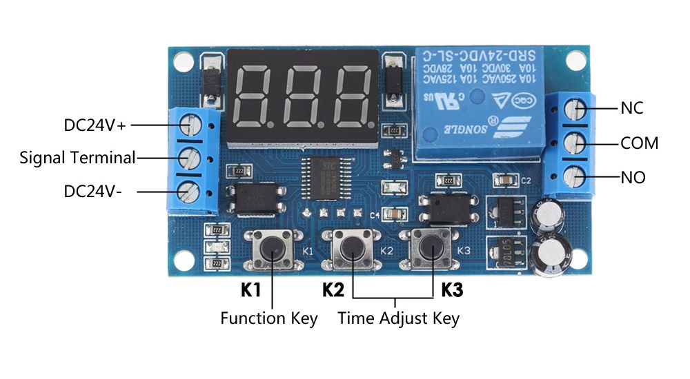 Таймер будет циклически (попеременно) включать и выключать реле в заданном интервале времени. Сигнал запуска на контакте IN никак не влияет на работу таймера. Кнопкой К1 можно самостоятельно изменять состояние реле на противоположное.